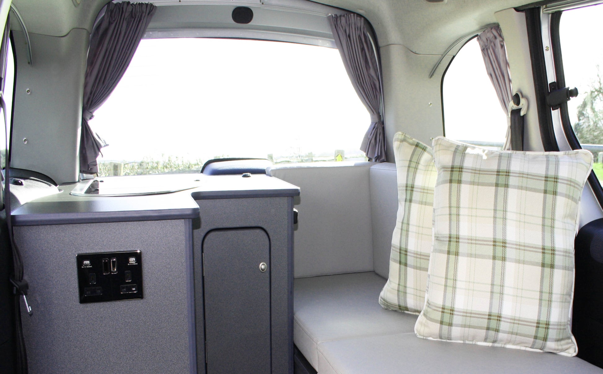 These curtains look fantastic once in place, giving your micro camper a real homely feel to it whilst providing you with privacy. The give a softer cleaner look than the stick on blackout blinds and also help to keep your camper warm. Easy to take down and wash, they are purposely cut to fit inside the recess of the window bays. Each set comprises of one pair for the back door, one pair for the rear window, one pair for the sliding door and one large curtain which fits around the front of the cab inside the windscreen.